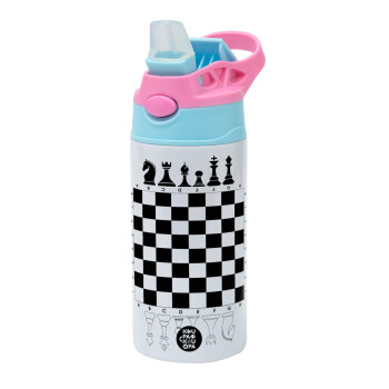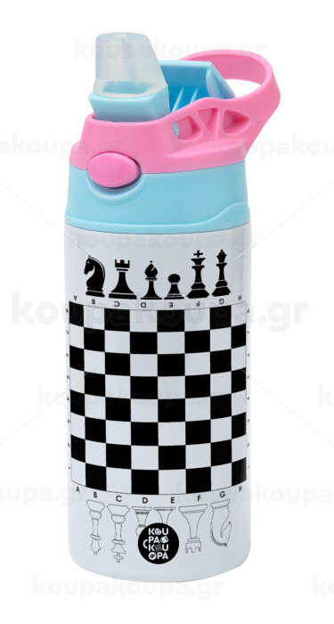 Σκάκι, Παιδικό παγούρι θερμό, ανοξείδωτο, με καλαμάκι ασφαλείας, Ροζ/Σιελ (360ml) BPA FREE
