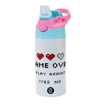 GAME OVER, Play again? YES - NO, Παιδικό παγούρι θερμό, ανοξείδωτο, με καλαμάκι ασφαλείας, Ροζ/Σιελ (360ml) BPA FREE