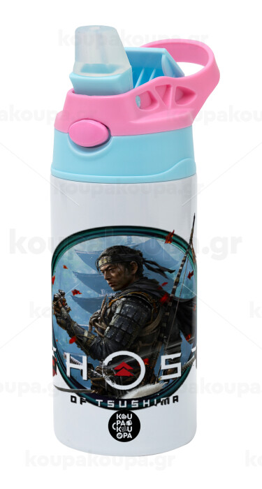 Ghost of Tsushima, Παιδικό παγούρι θερμό, ανοξείδωτο, με καλαμάκι ασφαλείας, Ροζ/Σιελ (360ml) BPA FREE