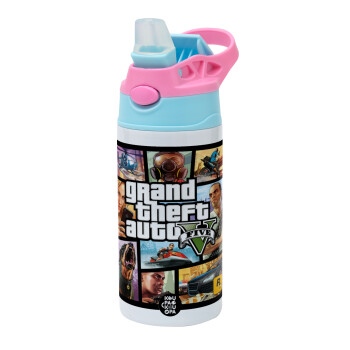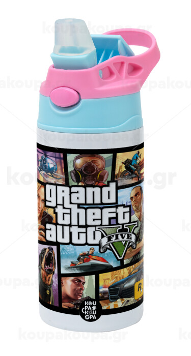 GTA V, Παιδικό παγούρι θερμό, ανοξείδωτο, με καλαμάκι ασφαλείας, Ροζ/Σιελ (360ml) BPA FREE