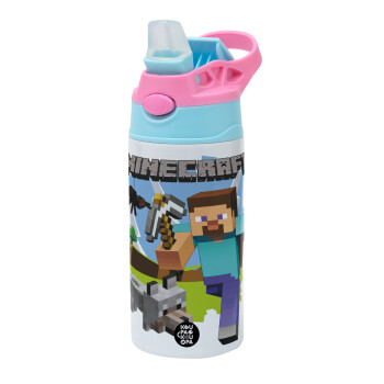 Minecraft Alex, Παιδικό παγούρι θερμό, ανοξείδωτο, με καλαμάκι ασφαλείας, Ροζ/Σιελ (360ml) BPA FREE