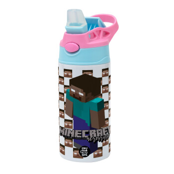 Minecraft herobrine, Παιδικό παγούρι θερμό, ανοξείδωτο, με καλαμάκι ασφαλείας, Ροζ/Σιελ (360ml) BPA FREE