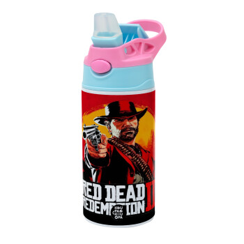 Red Dead Redemption 2, Παιδικό παγούρι θερμό, ανοξείδωτο, με καλαμάκι ασφαλείας, Ροζ/Σιελ (360ml) BPA FREE