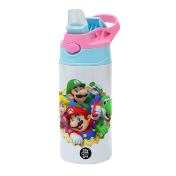 Super mario and Friends, Παιδικό παγούρι θερμό, ανοξείδωτο, με καλαμάκι ασφαλείας, Ροζ/Σιελ (360ml) BPA FREE