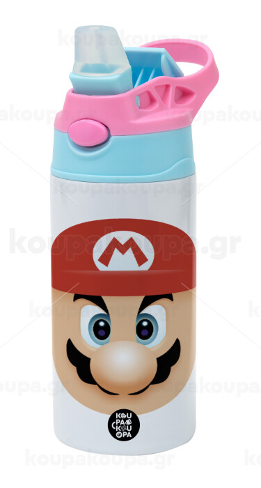 Super mario flat, Παιδικό παγούρι θερμό, ανοξείδωτο, με καλαμάκι ασφαλείας, Ροζ/Σιελ (360ml) BPA FREE