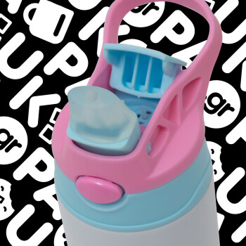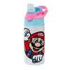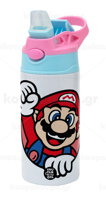 Super mario win, Παιδικό παγούρι θερμό, ανοξείδωτο, με καλαμάκι ασφαλείας, Ροζ/Σιελ (360ml) BPA FREE