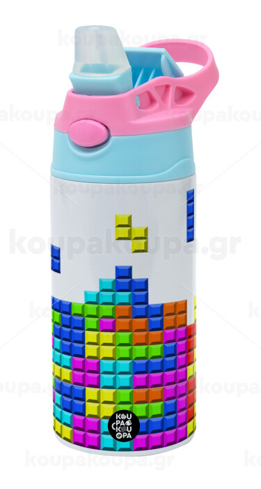 Tetris blocks, Παιδικό παγούρι θερμό, ανοξείδωτο, με καλαμάκι ασφαλείας, Ροζ/Σιελ (360ml) BPA FREE