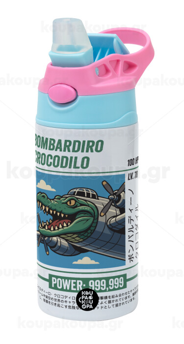Bombardiro Crocodilo, Παιδικό παγούρι θερμό, ανοξείδωτο, με καλαμάκι ασφαλείας, Ροζ/Σιελ (360ml) BPA FREE