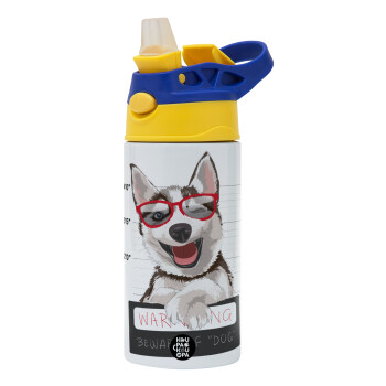 Warning, beware of Dog, Παιδικό παγούρι θερμό, ανοξείδωτο, με καλαμάκι ασφαλείας, πράσινο/μπλε (360ml) BPA FREE