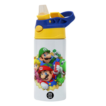 Super mario and Friends, Παιδικό παγούρι θερμό, ανοξείδωτο, με καλαμάκι ασφαλείας, πράσινο/μπλε (360ml) BPA FREE