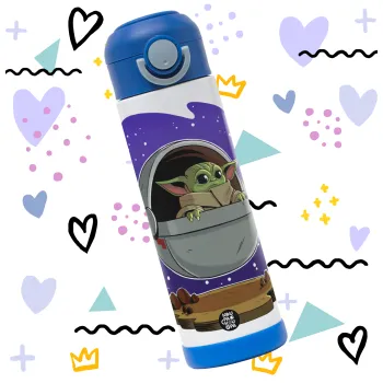 Baby Yoda mandalorian, Παιδικό παγούρι θερμό, ανοξείδωτο, με καλαμάκι ασφαλείας, ΜΠΛΕ (500ml)