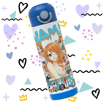 Nami One Piece, Παιδικό παγούρι θερμό, ανοξείδωτο, με καλαμάκι ασφαλείας, ΜΠΛΕ (500ml)