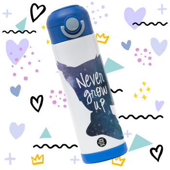 Never Grow UP, Παιδικό παγούρι θερμό, ανοξείδωτο, με καλαμάκι ασφαλείας, ΜΠΛΕ (500ml)