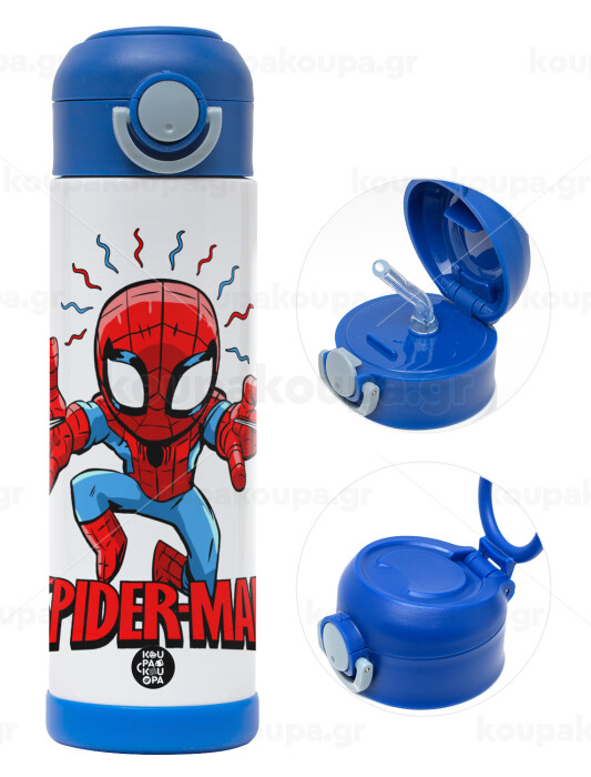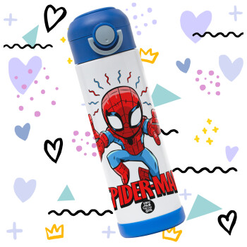 Spiderman flying, Παιδικό παγούρι θερμό, ανοξείδωτο, με καλαμάκι ασφαλείας, ΜΠΛΕ (500ml)