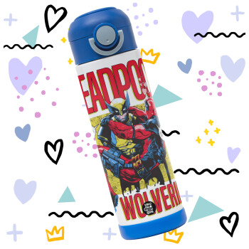 Superhero Deadpool Wolverine, Παιδικό παγούρι θερμό, ανοξείδωτο, με καλαμάκι ασφαλείας, ΜΠΛΕ (500ml)