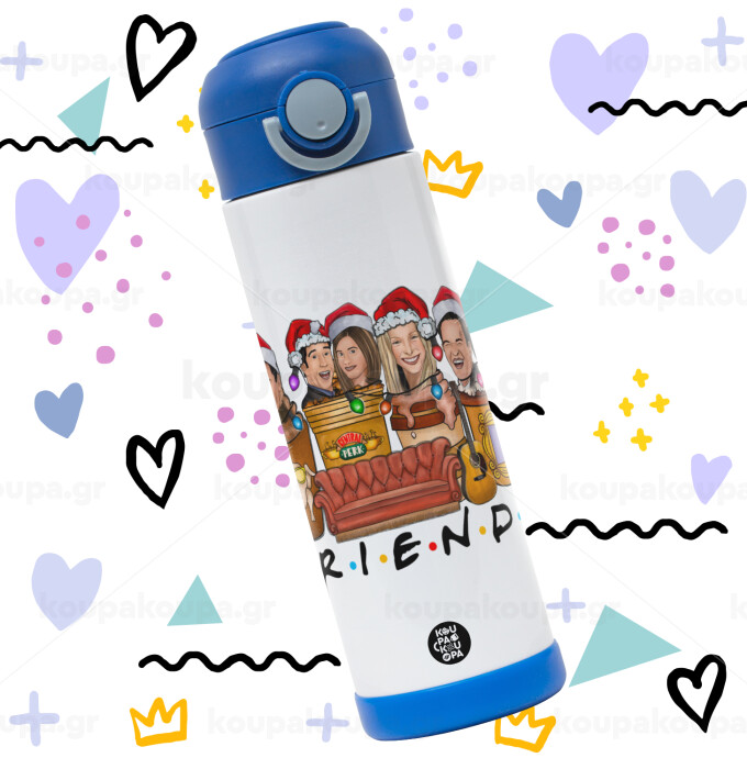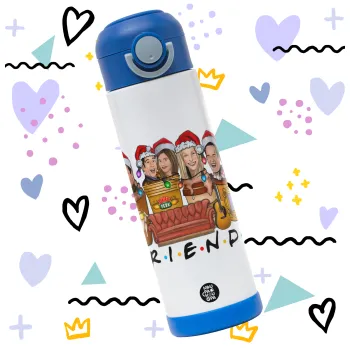 FRIENDS xmas, Παιδικό παγούρι θερμό, ανοξείδωτο, με καλαμάκι ασφαλείας, ΜΠΛΕ (500ml)