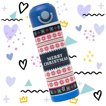 Merry Christmas Vintage, Παιδικό παγούρι θερμό, ανοξείδωτο, με καλαμάκι ασφαλείας, ΜΠΛΕ (500ml)