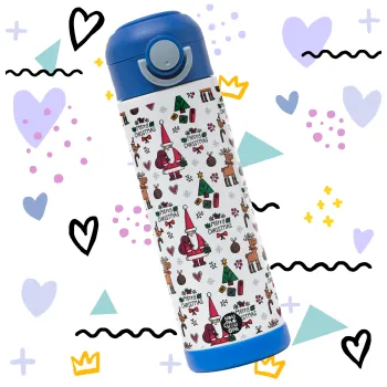 Santas, Deers & Trees, Παιδικό παγούρι θερμό, ανοξείδωτο, με καλαμάκι ασφαλείας, ΜΠΛΕ (500ml)