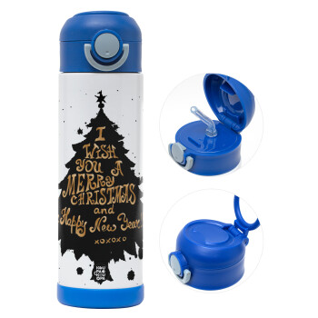 Tree, i wish you a merry christmas and a Happy New Year!!! xoxoxo, Παιδικό παγούρι θερμό, ανοξείδωτο, με καλαμάκι ασφαλείας, ΜΠΛΕ (500ml)