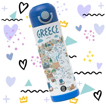 Χάρτης Ελλάδος, Παιδικό παγούρι θερμό, ανοξείδωτο, με καλαμάκι ασφαλείας, ΜΠΛΕ (500ml)