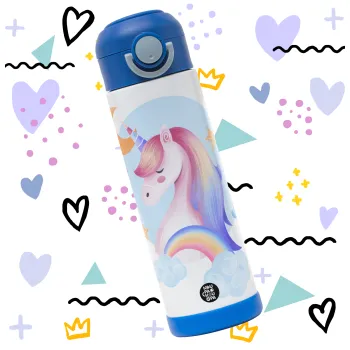 Μονόκερος, Παιδικό παγούρι θερμό, ανοξείδωτο, με καλαμάκι ασφαλείας, ΜΠΛΕ (500ml)