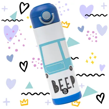 Car BEEP..., Παιδικό παγούρι θερμό, ανοξείδωτο, με καλαμάκι ασφαλείας, ΜΠΛΕ (500ml)