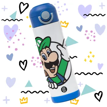 Super mario Luigi win, Παιδικό παγούρι θερμό, ανοξείδωτο, με καλαμάκι ασφαλείας, ΜΠΛΕ (500ml)