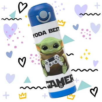 Yoda Best Gamer, Παιδικό παγούρι θερμό, ανοξείδωτο, με καλαμάκι ασφαλείας, ΜΠΛΕ (500ml)