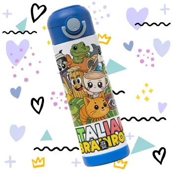 Italian Brainrot friends, Παιδικό παγούρι θερμό, ανοξείδωτο, με καλαμάκι ασφαλείας, ΜΠΛΕ (500ml)