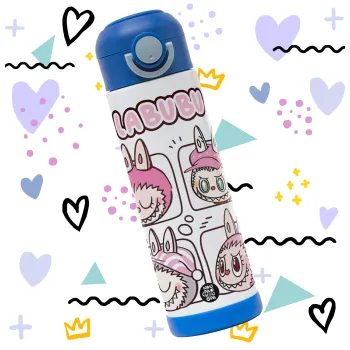 Labubu pink, Παιδικό παγούρι θερμό, ανοξείδωτο, με καλαμάκι ασφαλείας, ΜΠΛΕ (500ml)