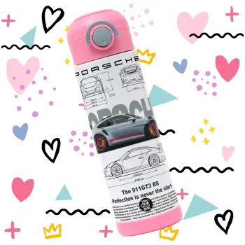 Porsche, Παιδικό παγούρι θερμό, ανοξείδωτο, με καλαμάκι ασφαλείας, ΡΟΖ (500ml)