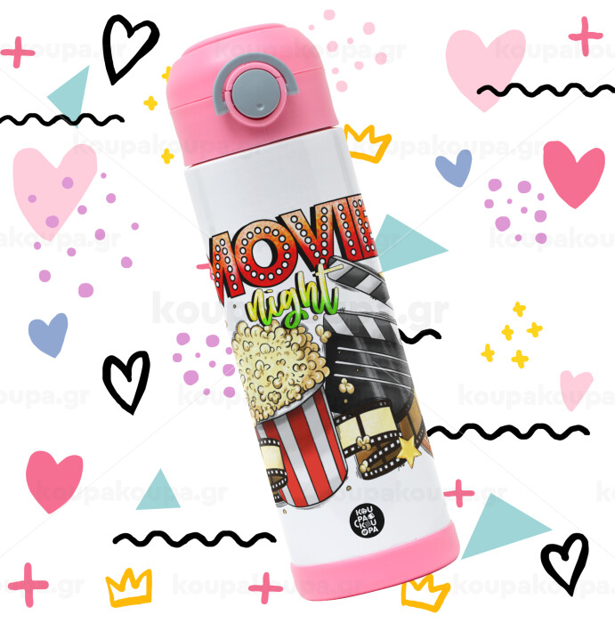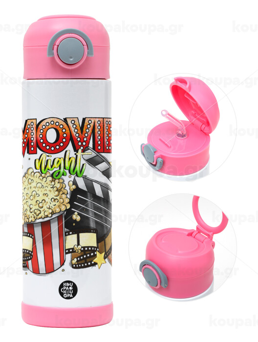 Movie night, Παιδικό παγούρι θερμό, ανοξείδωτο, με καλαμάκι ασφαλείας, ΡΟΖ (500ml)