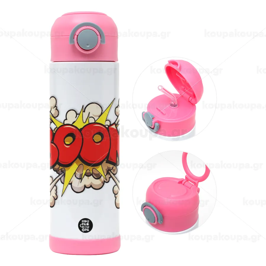 BOOM!!!, Παιδικό παγούρι θερμό, ανοξείδωτο, με καλαμάκι ασφαλείας, ΡΟΖ (500ml)