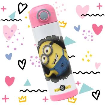 Minions hi, Παιδικό παγούρι θερμό, ανοξείδωτο, με καλαμάκι ασφαλείας, ΡΟΖ (500ml)