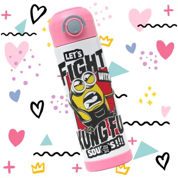 Minions Let's fight with kung fu sounds, Παιδικό παγούρι θερμό, ανοξείδωτο, με καλαμάκι ασφαλείας, ΡΟΖ (500ml)