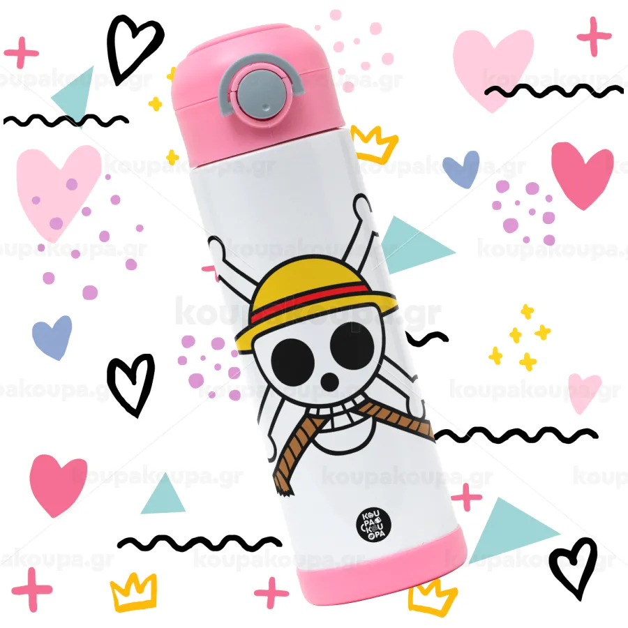 Onepiece skull, Παιδικό παγούρι θερμό, ανοξείδωτο, με καλαμάκι ασφαλείας, ΡΟΖ (500ml)