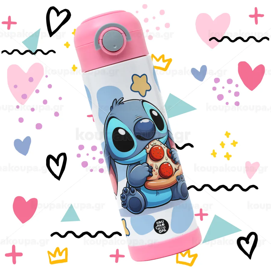 Stitch Pizza, Παιδικό παγούρι θερμό, ανοξείδωτο, με καλαμάκι ασφαλείας, ΡΟΖ (500ml)