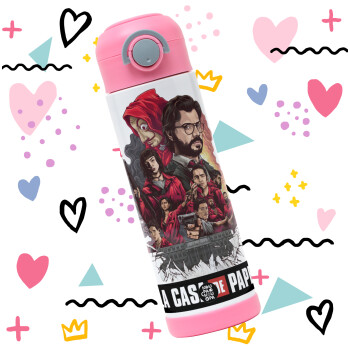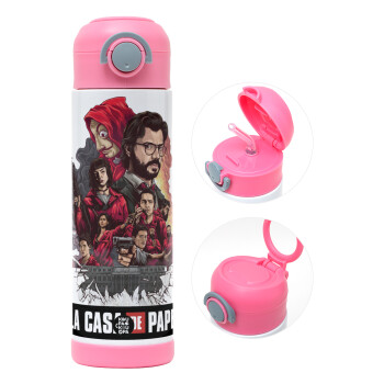 La casa de papel drawing cover, Παιδικό παγούρι θερμό, ανοξείδωτο, με καλαμάκι ασφαλείας, ΡΟΖ (500ml)