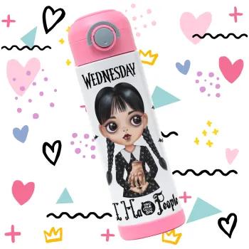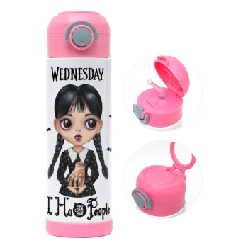 Wednesday Adams, i hate people, Παιδικό παγούρι θερμό, ανοξείδωτο, με καλαμάκι ασφαλείας, ΡΟΖ (500ml)