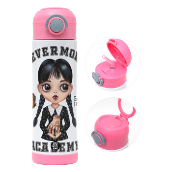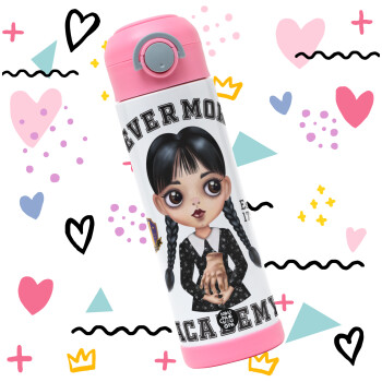 Wednesday Adams, nevermore, Παιδικό παγούρι θερμό, ανοξείδωτο, με καλαμάκι ασφαλείας, ΡΟΖ (500ml)