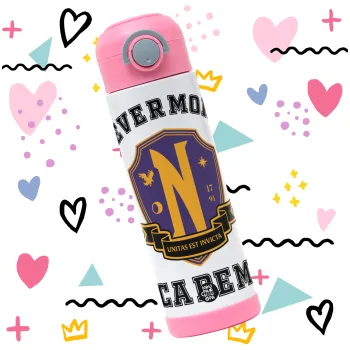 Wednesday Nevermore Academy University, Παιδικό παγούρι θερμό, ανοξείδωτο, με καλαμάκι ασφαλείας, ΡΟΖ (500ml)