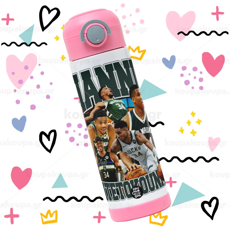 Giannis Antetokounmpo, Παιδικό παγούρι θερμό, ανοξείδωτο, με καλαμάκι ασφαλείας, ΡΟΖ (500ml)