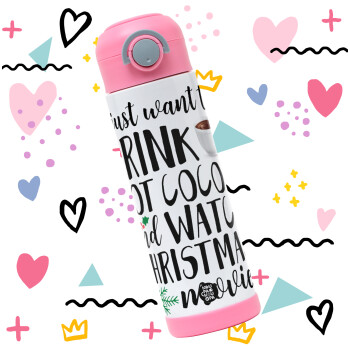 I just want to drink hot cocoa and watch christmas movies, Παιδικό παγούρι θερμό, ανοξείδωτο, με καλαμάκι ασφαλείας, ΡΟΖ (500ml)
