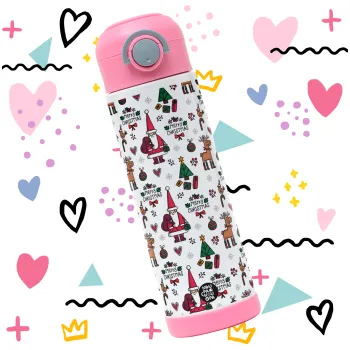 Santas, Deers & Trees, Παιδικό παγούρι θερμό, ανοξείδωτο, με καλαμάκι ασφαλείας, ΡΟΖ (500ml)