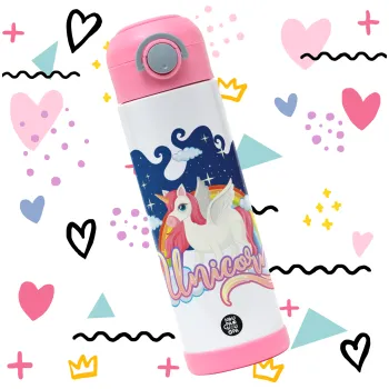 Μονόκερος, Παιδικό παγούρι θερμό, ανοξείδωτο, με καλαμάκι ασφαλείας, ΡΟΖ (500ml)