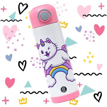 Cute cat unicorn, Παιδικό παγούρι θερμό, ανοξείδωτο, με καλαμάκι ασφαλείας, ΡΟΖ (500ml)