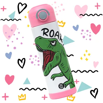 Dyno roar!!!, Παιδικό παγούρι θερμό, ανοξείδωτο, με καλαμάκι ασφαλείας, ΡΟΖ (500ml)