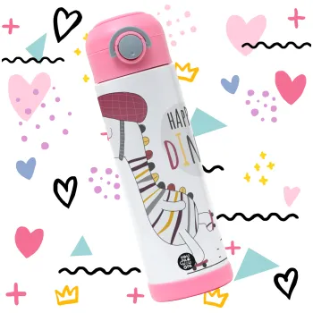 Happy Dino, Παιδικό παγούρι θερμό, ανοξείδωτο, με καλαμάκι ασφαλείας, ΡΟΖ (500ml)