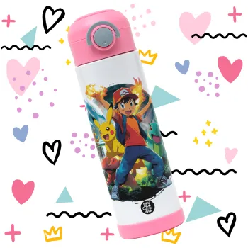 Ash Ketchum & Pikachu, Παιδικό παγούρι θερμό, ανοξείδωτο, με καλαμάκι ασφαλείας, ΡΟΖ (500ml)