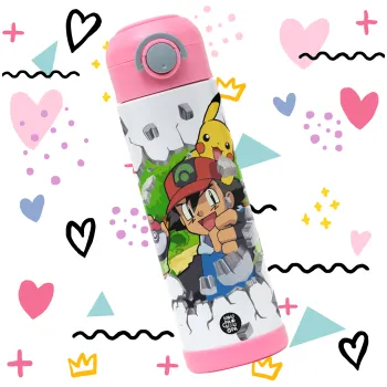 Pokemon brick, Παιδικό παγούρι θερμό, ανοξείδωτο, με καλαμάκι ασφαλείας, ΡΟΖ (500ml)